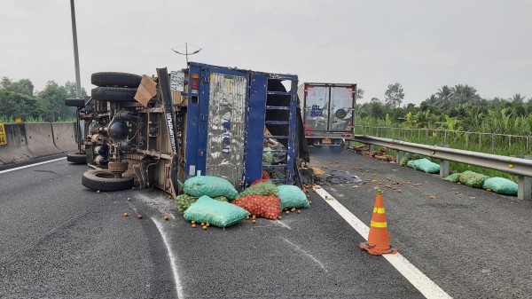 Khi đến đoạn thuộc địa bàn xã Tân Lý Đông, H.Châu Thành, Tiền Giang, xe tải bất ngờ bị sút bánh sau rồi lật ngang. Sau tai nạn, chiếc xe nằm chắn hết 2 làn đường cao tốc, củi trên xe đổ tràn xuống đường, giao thông bị ùn ứ kéo dài hơn 2 km.