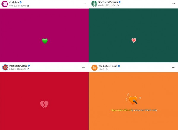 Những ngày vừa qua, cư dân mạng rần rần câu chuyện “tình tay ba” giữa Momo, Starbucks và Highlands. Mọi chuyện bắt đầu vào ngày 6/9, khi Momo và Starbuck đồng loạt lên bài đăng với cùng một kiểu: một trái tim trên một nền màu trơn. Nếu Momo đăng trái tim màu xanh trên nền hồng, thì Starbucks lại đăng tim hồng trên nền xanh. Xanh và hồng lần lượt là hai màu thương hiệu của Starbucks và Momo. Thì ra là hai thương hiệu này đang đẩy đưa, ẩn ý thông báo về vụ hợp tác cho phép khách hàng mua Starbucks thanh toán bằng Momo.