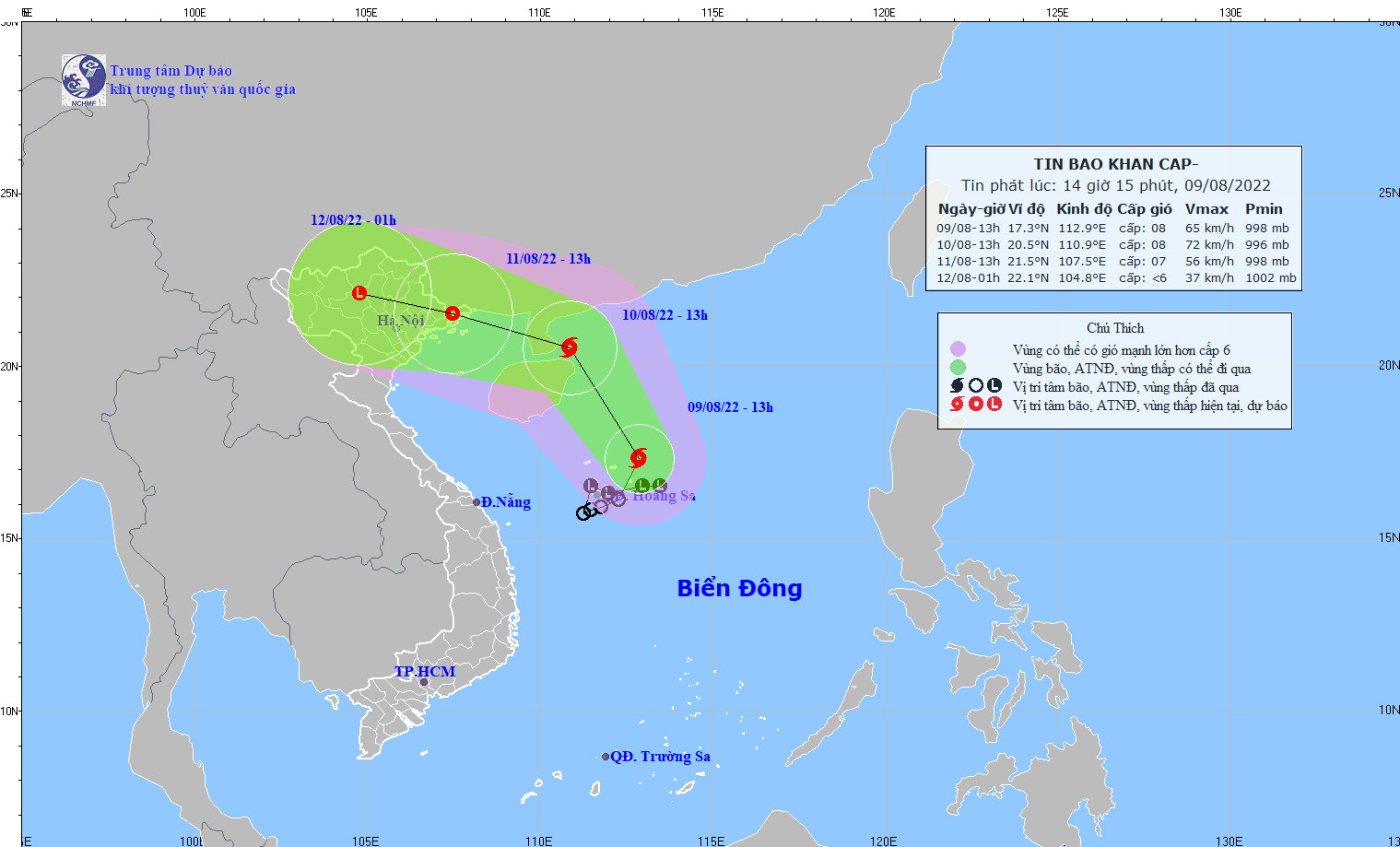 Theo Trung tâm Khí tượng thủy văn quốc gia, chiều nay (9.8) áp thấp nhiệt đới đã mạnh lên thành bão, cơn bão số 2 năm 2022 và có tên quốc tế là Mulan.