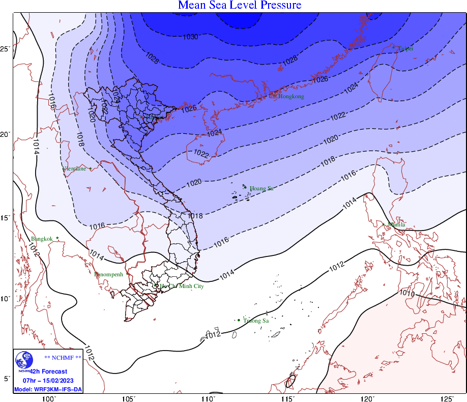 Hiện nay (14.2), trên khu vực vịnh Bắc bộ đã có gió đông bắc mạnh cấp 6, giật cấp 8. Dự báo, ngày và đêm nay, vịnh Bắc bộ có gió đông bắc mạnh cấp 6, có lúc cấp 7, giật cấp 8. Biển động mạnh, sóng biển cao từ 2 – 3,5 m. Khu vực bắc Biển Đông (bao gồm vùng biển quần đảo Hoàng Sa) có gió đông bắc mạnh cấp 6 – 7, giật cấp 8 – 9. Biển động mạnh, sóng biển cao từ 4 – 6 m.