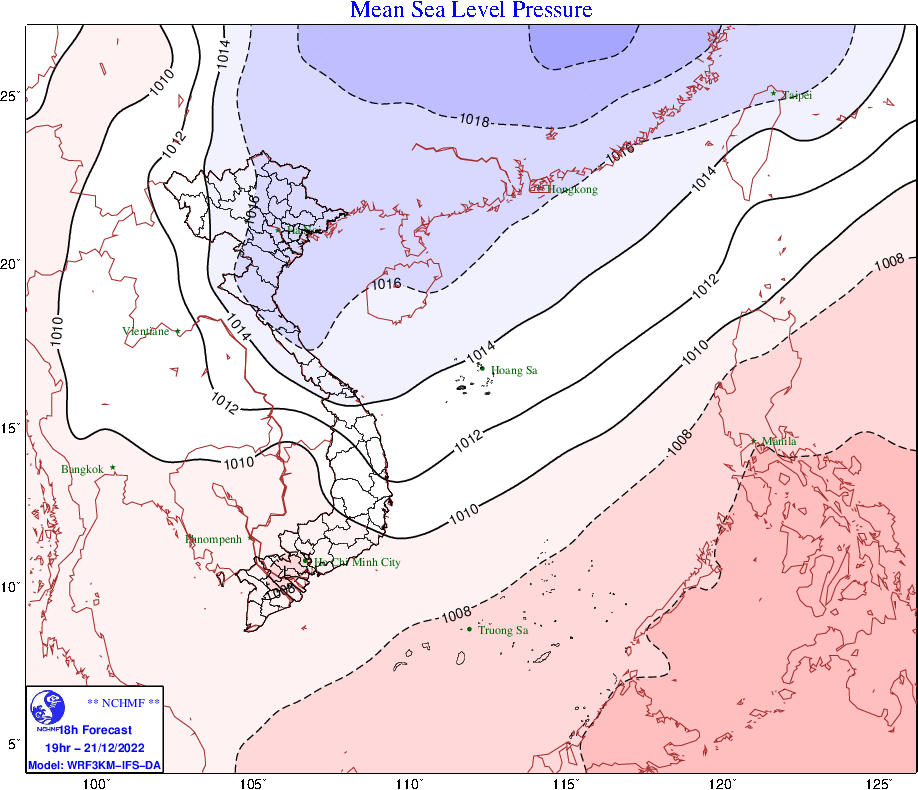 Dự báo, ngày và đêm nay (22.12), khu vực Biển Đông (bao gồm vùng biển hai quần đảo Hoàng Sa và Trường Sa), vùng biển từ Bình Định đến Cà Mau có gió Đông Bắc cấp 6, có lúc cấp 7, giật cấp 8 – 9. Biển động, sóng biển cao từ 3 – 5 m. Vùng biển từ Đà Nẵng đến Quảng Ngãi có gió Đông Bắc cấp 6, giật cấp 7 – 8. Biển động, sóng biển cao từ 2 – 4 m.