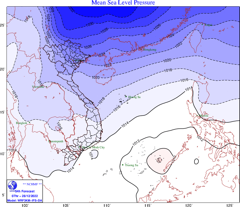 Khoảng gần sáng và ngày 28.12, bộ phận không khí lạnh này sẽ ảnh hưởng đến Bắc bộ, sau đó ảnh hưởng đến Bắc và Trung Trung bộ |