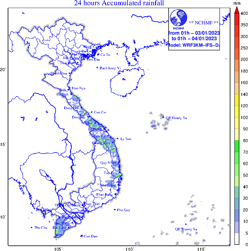 Dự báo, ngày và đêm 3.1, khu vực từ Quảng Bình đến Khánh Hòa có mưa, mưa rào và có nơi có giông, cục bộ có nơi mưa to với lượng mưa 10 – 30 mm, có nơi trên 50 mm.