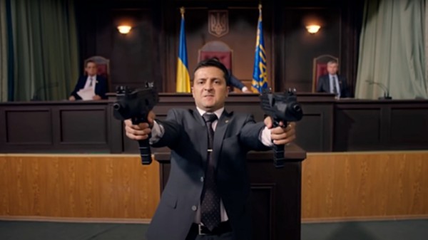 Ông Zelensky cầm 2 súng khi đóng vai trong một vở hài kịch trước đây. Ảnh: Kvartal. Trong đoạn phỏng vấn được phát sóng vào hôm 29/4 trên kênh 1+1 của Ukraine, ông Zelensky nói: “Tôi biết cách bắn súng”.