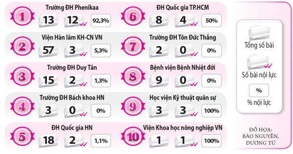 Trong số 72 bài báo của 10 đơn vị dẫn đầu nghiên cứu chất lượng cao tại Việt Nam (theo Nature Index 2022), chỉ có 26 bài thể hiện được nội lực nghiên cứu của các đơn vị này. Cụ thể, Trường ĐH Phenikaa dẫn đầu với 12 bài, theo sau lần lượt là ĐH Quốc gia TP.HCM 4 bài, Viện Hàn lâm Khoa học và Công nghệ Việt Nam cùng Học viện Kỹ thuật quân sự mỗi đơn vị có 3 bài, Trường ĐH Duy Tân và ĐH Quốc gia Hà Nội mỗi đơn vị cùng có 2 bài, Viện Khoa học nông nghiệp Việt Nam có 1 bài.