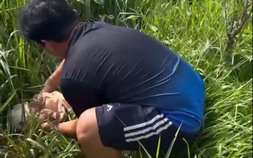Trẻ được quấn trong một chiếc khăn, đặt ven đường có cỏ mọc um tùm, sát mép nước.
