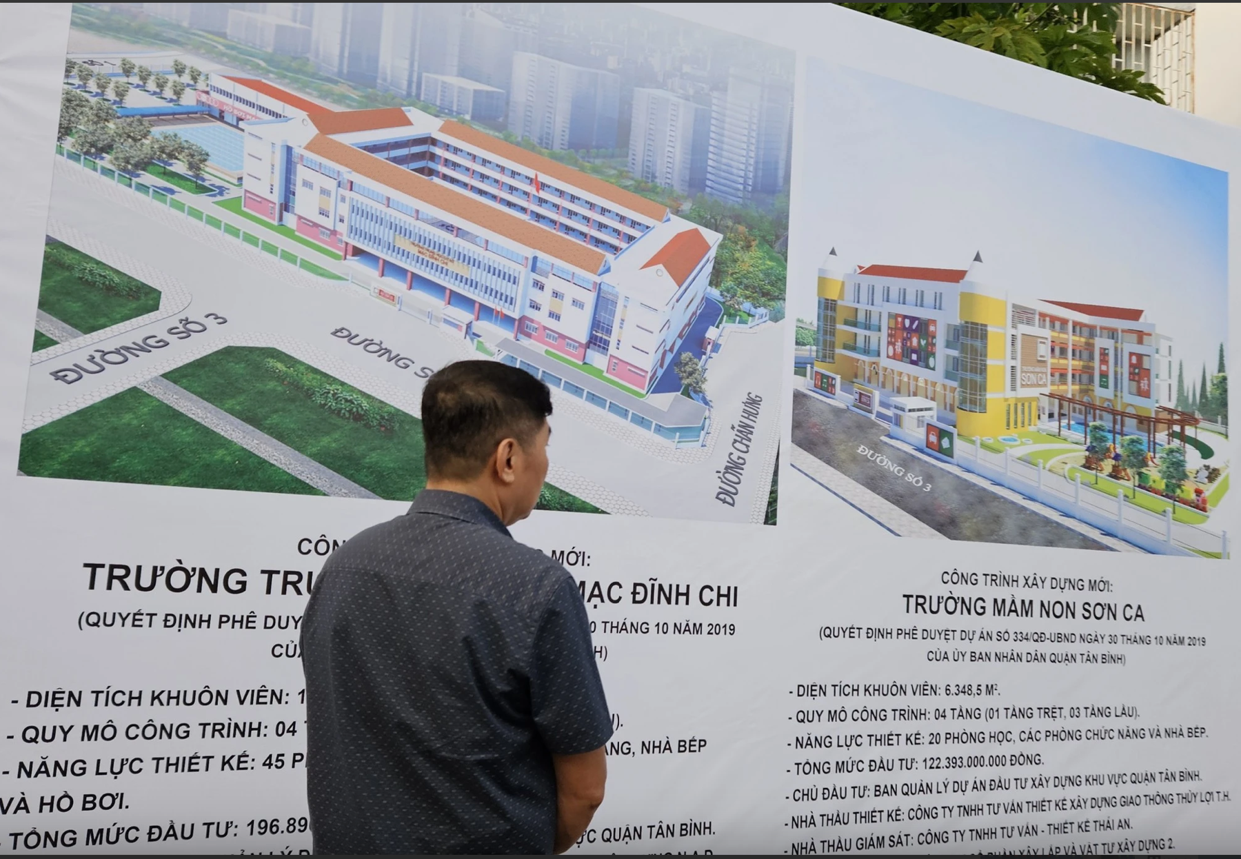Người dân xem thông tin về cụm 3 trường học vừa được khởi công tại trụ sở UBND P.6, Q.Tân Bình