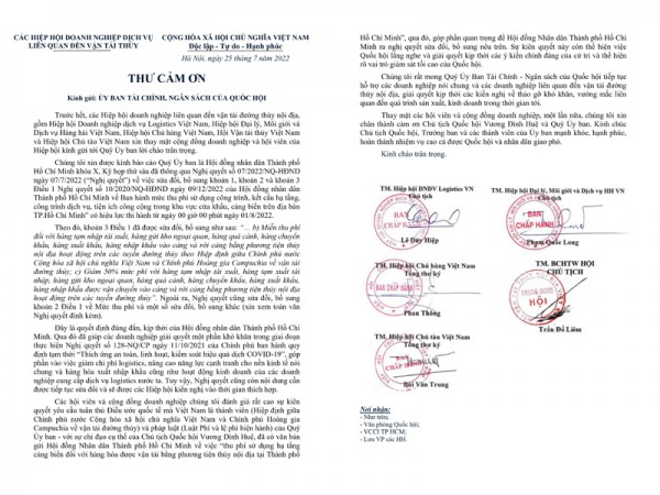Thư cảm ơn của Hiệp hội doanh nghiệp liên quan đến vận tải đường thủy nội địa