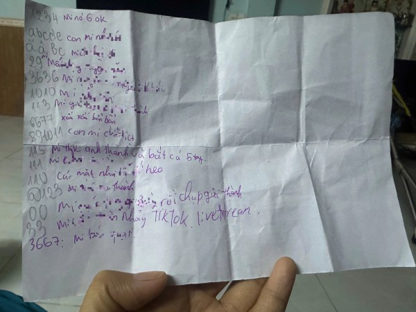 Trao đổi với PV Báo Thanh Niên chiều 21.4, chị V.T, mẹ của bé M. gửi kèm tờ giấy mà nhóm học sinh lớp 5 viết về con gái chị với những từ ngữ gây sốc. Đáng chú ý, nhiều câu từ được nhóm học sinh quy ước thành các mật mã là số và chữ cái.