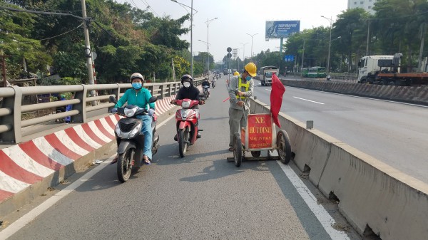 Công nhân tiến hành thu gom, hút đinh trên dốc cầu vượt Tỉnh lộ 10 |