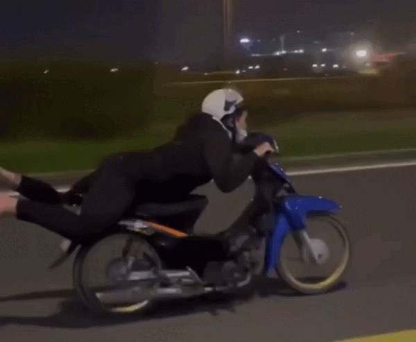 Mạng xã hội lan truyền đoạn clip ghi lại cảnh một nam thanh niên ‘diễn xiếc’ bằng cách nằm sấp trên yên, chân duỗi thẳng ra sau, hai tay vươn ra nắm chặt tay lái, điều khiển chiếc xe lao vun vút.