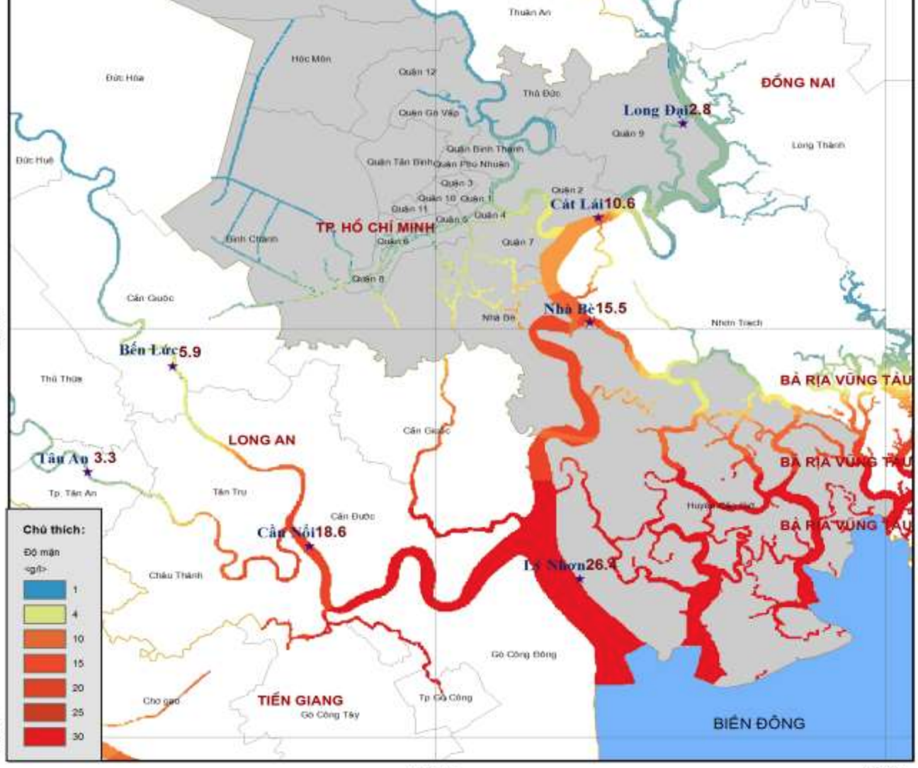 Trên sông Sài Gòn, độ mặn 4‰ có thể vào sâu thêm 5 km trong những ngày tới do triều cường cao kết hợp với gió mùa đông bắc mạnh