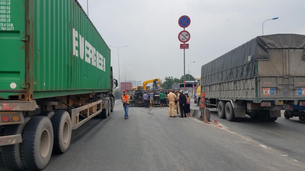 Tại hiện trường, xe tải hư hỏng nằm chắn ngang trên làn ô tô, đầu xe vắt trên dải phân cách cứng. Vụ lật xe tải khiến giao thông trên QL1 hướng đi về Q.Bình Tân ùn ứ kéo dài nhiều cây số trong nhiều giờ.