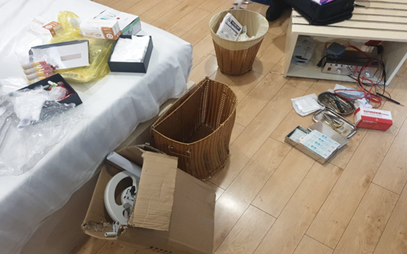 Tại phòng 407, đoàn phát hiện có các dụng cụ, trang thiết bị y tế gồm: bông, gạc, thuốc sát trùng, máy đốt, đèn tiểu phẫu, dụng cụ tiểu phẫu, mực phun xăm, thuốc uống, thuốc tê, hộp tiêm filler… đã mở và đang sử dụng. Trong nhà vệ sinh, đoàn phát hiện trong thùng rác có băng gạc thấm máu tươi, ống thuốc, kim tiêm… đã sử dụng. Đoàn đã tiến hành niêm phong, tạm giữ các dụng cụ, trang thiết bị y tế nêu trên.