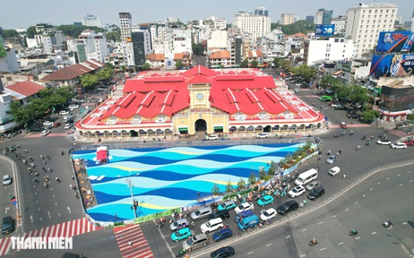 Khu vực phía trước ngôi chợ biểu tượng ở trung tâm TP.HCM được sơn màu tạo hình sóng nước nổi bật, khiến không ít người đặt câu hỏi về tính hài hòa và thẩm mỹ của công trình với kiến trúc xung quanh Ảnh: Y Kiện