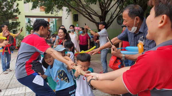 Các bé Trường mầm non 19 tháng 5, Q.8 cùng phụ huynh, thầy cô giáo chơi kéo co sáng nay