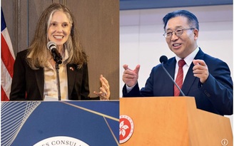 Tổng lãnh sự Mỹ tại Hồng Kông Julie Eadeh và Đặc phái viên Bộ Ngoại giao Trung Quốc tại Hồng Kông Thôi Kiến Xuân đã gặp nhau 2 lần trong 2 tuần Ảnh: Chụp màn hình SCMP