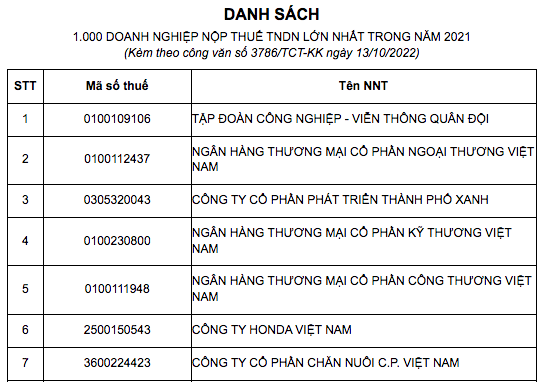 Tổng cục thuế (Bộ Tài chính) vừa có văn bản công khai danh sách 1.000 doanh nghiệp nộp thuế thu nhập doanh nghiệp lớn nhất trong năm 2021 |