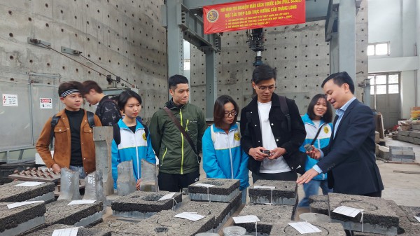 Giảng viên Trường ĐH Giao thông vận tải giới thiệu với sinh viên về công nghệ xử lý mặt cầu Thăng Long do nhà trường nghiên cứu