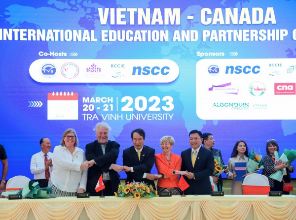PGS-TS Phạm Tiết Khánh, Chủ tịch Hội đồng trường, Chủ tịch Hiệp hội CĐCĐ Việt Nam và PGS-TS Nguyễn Minh Hòa, Hiệu trưởng TVU, ký kết nâng tầm hợp tác với các tổ chức, viện, trường Canada