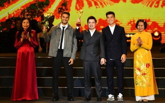 Phó Chủ tịch T&T Group Đỗ Vinh Quang cùng hai cầu thủ Đỗ Duy Mạnh, Đỗ Hoàng Hên nhận giải Khát vọng cống hiến tối 15.4