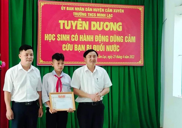 Sáng nay, 25.4, trao đổi với Thanh Niên, ông Võ Kim Nghĩa, Hiệu trưởng Trường THCS Minh Lạc (H.Cẩm Xuyên, Hà Tĩnh), cho biết vào sáng cùng ngày, nhà trường đã tổ chức lễ tuyên dương, trao tặng giấy khen cho em Nguyễn Văn Dương (học sinh lớp 8D) vì có hành động dũng cảm cứu sống thành công 2 em nhỏ bị đuối nước khi tắm mát dưới kênh nước thủy lợi.