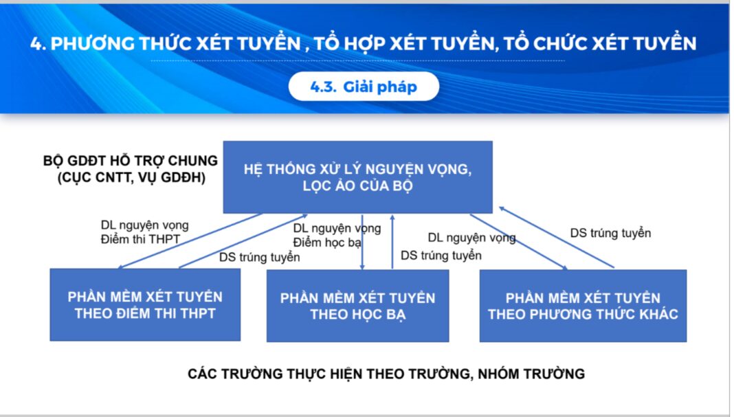 Nếu phương thức xét tuyển bằng phương thức khác học bạ, hoặc dựa trên học bạ nhưng phức tạp hơn cần một hệ thống riêng thì phải thông báo rõ cho thí sinh để đăng ký, nộp hồ sơ xét tuyển cho trường, đồng thời đăng ký nguyện vọng trên hệ thống của Bộ GD-ĐT. Các trường có thể chạy phần mềm xét tuyển trước, nhưng sẽ tải danh sách trúng tuyển lên hệ thống của Bộ GD-ĐT để lọc ảo cùng với các phương thức khác.