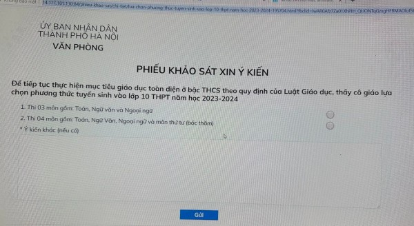 Phiếu khảo sát xin ý kiến thi 3 hay 4 môn để tuyển sinh vào lớp 10 trên Cổng thông tin điều hành của UBND TP.Hà Nội