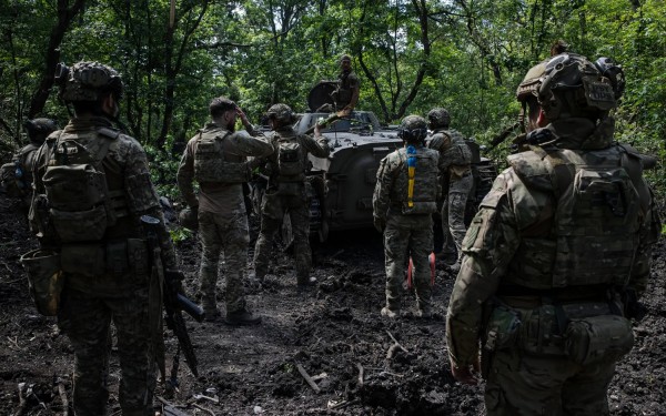 Đoàn xe thiết giáp Bradley gầm rú tiến về phía trước, trong xe có các binh sĩ Ukraine. Bradley là một vũ khí lợi hại mới do Mỹ cung cấp và được quân đội Ukraine sử dụng cho mặt trận phía Nam.