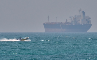 Một chiếc xuồng gần tàu chở dầu tại eo biển Hormuz ngày 18.4 ẢNH: AP