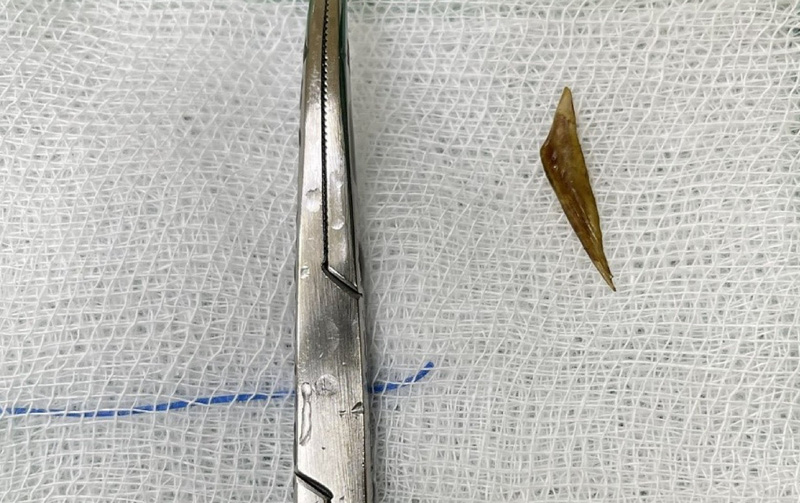 Kết quả xét nghiệm máu cho thấy có tình trạng nhiễm trùng và CTScan ghi nhận dấu hiệu viêm phúc mạc ổ bụng, đồng thời phát hiện một mảnh dị vật nằm trong ruột non của bệnh nhân, 2 đầu dị vật nhọn làm thủng ruột non. Các bác sĩ lập tức tiến hành phẫu thuật nội soi thám sát.
