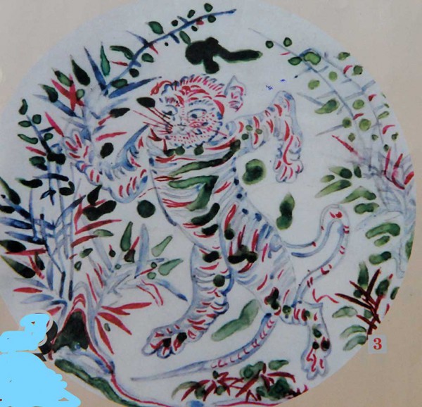 Nhân tiện cũng xin giới thiệu thêm về 2 tiêu bản còn lại. Đĩa thứ hai có kích thước lớn hơn một chút (đường kính 35cm), hình vẽ có 3 màu, mô tả con hổ dáng đứng. Hai chân sau và chân trước bên phải kiểu như dáng con người vươn ra nắm khóm cây (giống cây tre), còn chân kia choãi ra sau. Con hổ có đuôi dài đưa ra trước đến chấm đất, cách vẽ nhân cách hóa cho người xem cảm giác hổ đang vạch lá dọn đường đi. Do ngâm lâu dưới đáy biển, nước mặn đã khiến màu đỏ, lục bị xỉn và mất đi. So sánh với một số cổ vật cùng địa điểm và niên đại, tôi cũng mạnh dạn vẽ phục chế 2 màu đỏ và lục đã mất. Đĩa thứ ba có đường kính 34cm, vẽ hình con hổ đang vồ mồi, bao xung quanh là dày đặc với những đám mây, màu lục và đỏ cũng bị xỉn.