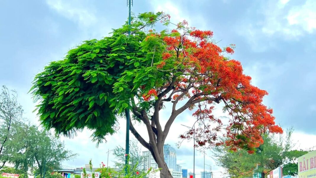 Phượng vĩ là cây trồng phổ biến, quen thuộc với mọi người khắp mọi miền. Song cây phượng trên đường Thùy Vân, TP. Vũng Tàu (Bà Rịa – Vũng Tàu) được chú ý từ trên mạng xã hội lẫn ngoài đời thực nhờ nửa xanh ngắt lá, nửa đỏ rực hoa.
