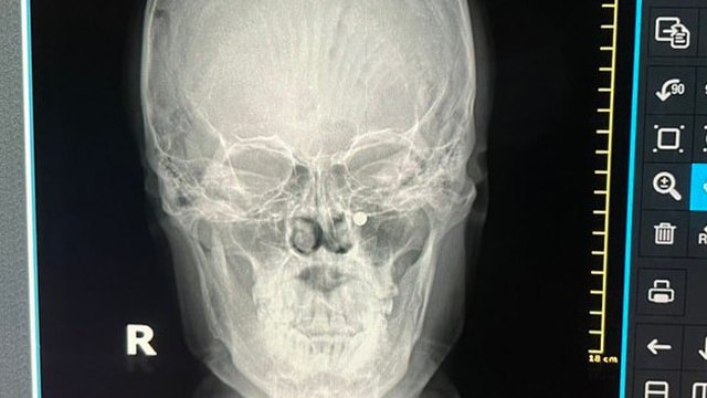 Khi bệnh nhân đến viện, mũi vẫn còn chảy máu, hốc mũi sưng nề. Máu chảy ngập trong mũi nên bác sĩ không thể nội soi; phim chụp XQ cho thấy có 2 dị vật trong mũi, trôi tới gần hốc mắt.