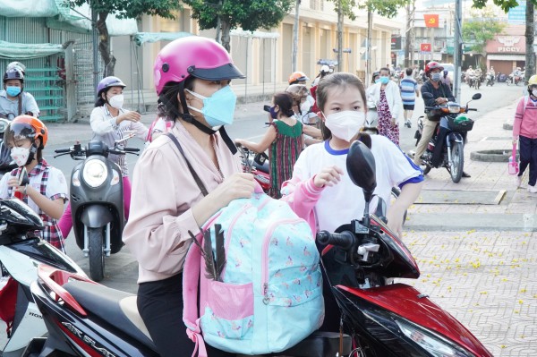 Chị Lê Kim Yến yên tâm đưa con đến trường học trực tiếp |