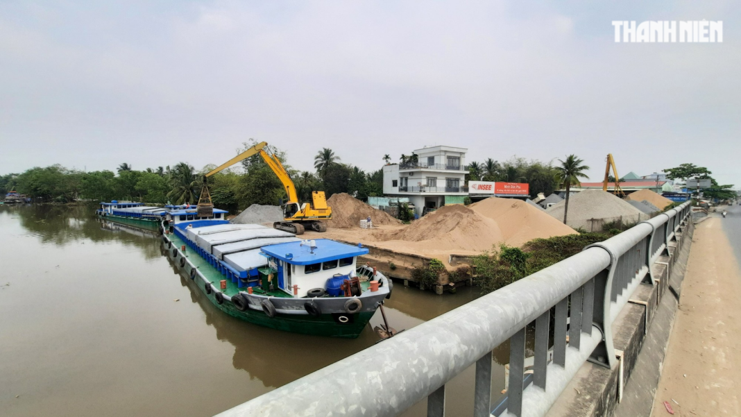Trên bờ là bãi vật liệu xây dựng của Công ty M.Đ.P (do ông N.Q.A là người đại diện) có 1 cần cẩu loại lớn và rất nhiều đống cát, đá khổng lồ nằm cạnh QL53. Đáng chú ý, phía bờ bãi vật liệu xây dựng này có cắm 1 bảng được phép neo đậu tàu thuyền với khoảng cách 40 m hướng về cầu Ông Me Lớn.