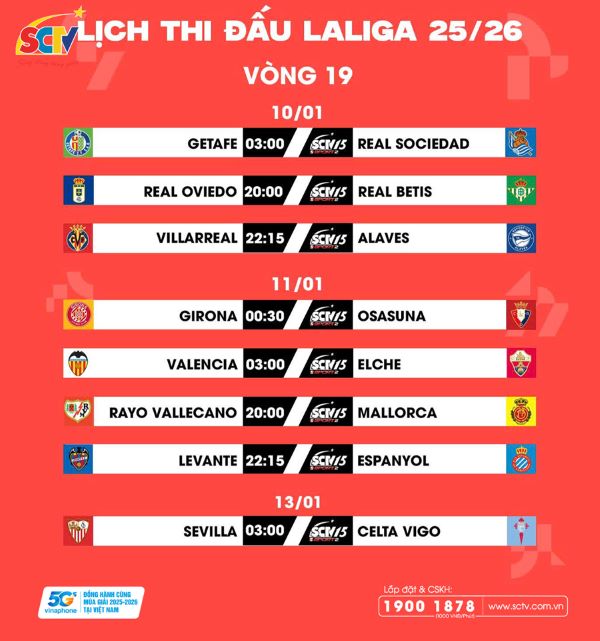 Năm nay, Giải vô địch quốc gia Tây Ban Nha LALIGA EA SPORTS phát trên chuỗi kênh SCTV Thể Thao có sự đồng hành của nhà mạng VinaPhone nhằm mang đến giải đấu chất lượng, siêu sắc nét nhất cho khán giả. Quý khách hàng có nhu cầu đăng ký internet, truyền hình cáp SCTV và tải ứng dụng xem truyền hình trực tuyến SCTVOnline để theo dõi các trận cầu hấp dẫn trên, vui lòng truy cập website: sctv.com.vn hoặc liên hệ tổng đài chăm sóc khách hàng 19001878 để được tư vấn thêm.