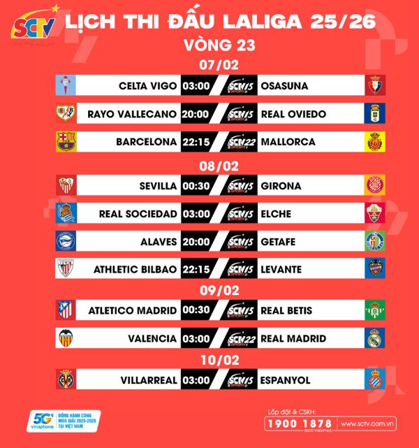 Năm nay, Giải vô địch quốc gia Tây Ban Nha LALIGA EA SPORTS phát trên chuỗi kênh SCTV Thể Thao có sự đồng hành của nhà mạng VinaPhone nhằm mang đến giải đấu chất lượng, siêu sắc nét nhất cho khán giả. Quý khách hàng có nhu cầu đăng ký internet, truyền hình cáp SCTV và tải ứng dụng xem truyền hình trực tuyến SCTVOnline để theo dõi các trận cầu hấp dẫn trên, vui lòng truy cập website: sctv.com.vn hoặc liên hệ tổng đài chăm sóc khách hàng 19001878 để được tư vấn thêm.