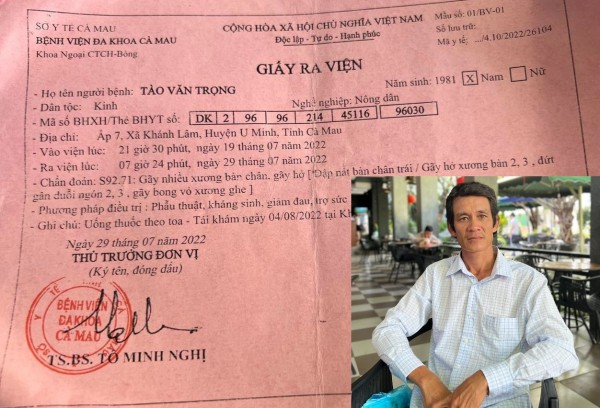 Theo giấy ra viện của Bệnh viện đa khoa Cà Mau, anh Trọng bị gãy nhiều xương bàn chân, dập nát bàn chân trái, gãy hở xương bàn 2 – 3, đứt gân duỗi ngón 3 – 4…