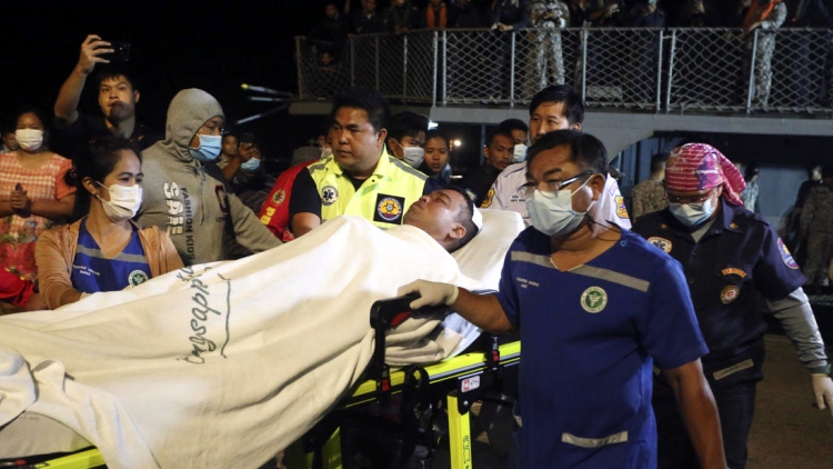 Một thủy thủ được giải cứu từ tàu hộ tống HTMS Sukhothai và được chuyển vào đất liền tại cảng Bang Saphan, tỉnh Prachuap Khiri Khan, Thái Lan, hôm 19/12. Ảnh: Anuthep Cheysakron/APTàu hộ vệ HTMS Sukhothai do Mỹ sản xuất, được sử dụng từ năm 1987. Tàu bị trục trặc động cơ và chìm cách tỉnh Prachuap Khiri Khan khoảng 20 hải lý trong điều kiện gió to và biển động mạnh chưa từng được ghi nhận trong vòng 1 thập kỷ trở lại đây. Vào thời điểm bị chìm, tàu chở 105 quân nhân, và 76 người trong số này đã được giải cứu an toàn.