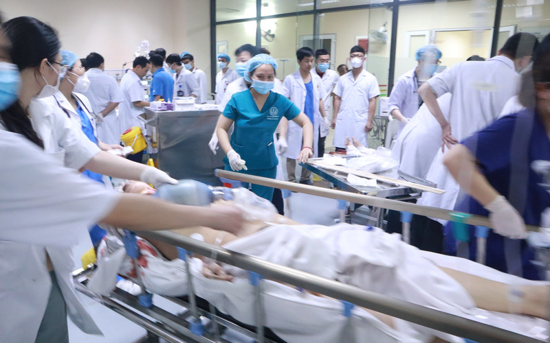 ThS.BS Phạm Xuân Hiếu – Trưởng khoa Cấp cứu – Bệnh viện E cho biết, vào khoảng 16h30 đến 16h50, các phương tiện cấp cứu lần lượt chuyển 14 trường hợp tai nạn giao thông vào khoa Cấp cứu. Người nhỏ tuổi nhất là 7 tuổi, người lớn tuổi nhất là 42 tuổi. Trong số đó có 2 ca rất nặng: trường hợp nam, 28 tuổi, quê Thái Bình bị hôn mê sâu do chấn thương sọ não chuyển khoa Hồi sức tích cực và chống độc để theo dõi; Trường hợp khác, nam 37 tuổi, ở Đống Đa, Hà Nội phải mổ cấp cứu do sốc đa chấn thương: chấn thương bụng kín, chấn thương ngực kín, gãy hở IIIB xương cẳng chân dập nát.
