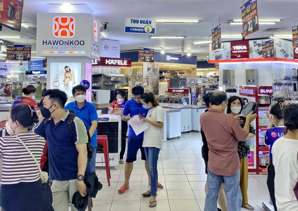 Anh Nguyễn Hữu Phước (28 tuổi) háo hức cùng vợ sắp cưới, chị Nguyễn Lê Bích Khuê (27 tuổi, cùng ngụ Q.11) mua TV mới. Nhà có cái TV xài hơn 10 năm qua, anh nói đây là thời điểm thích hợp để mua mới, vì dịp World Cup 2022 và đợt sale này nhiều siêu thị có các chương trình khuyến mãi.