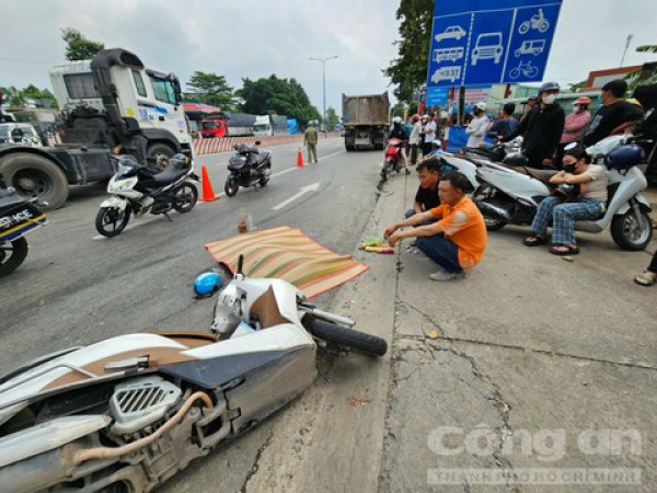 Va chạm làm cho người phụ nữ ngã xuống đường bị bánh xe ben cán tử vong tại chỗ. Hiện trường cả người và 2 phương tiện đều nằm trong làn xe máy.