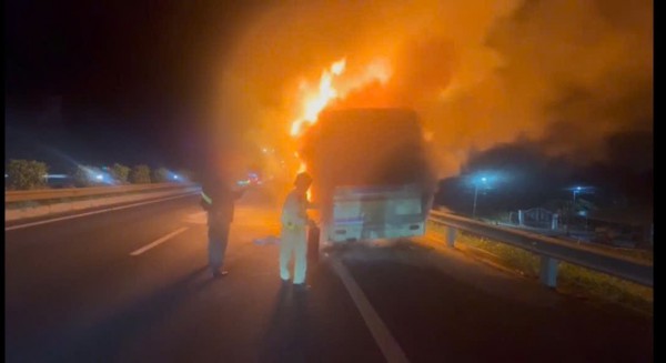Phát hiện có mùi khét, tài xế dừng xe kiểm tra thì phát hiện cháy tại hầm máy bên phía tài xế nên hô hoán dập lửa.