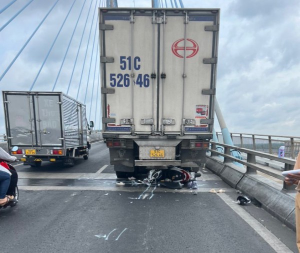 Vụ xe máy va chạm vào đuôi xe tải trên cầu Mỹ Thuận lúc sáng 8.5 khiến 2 người nguy kịch.