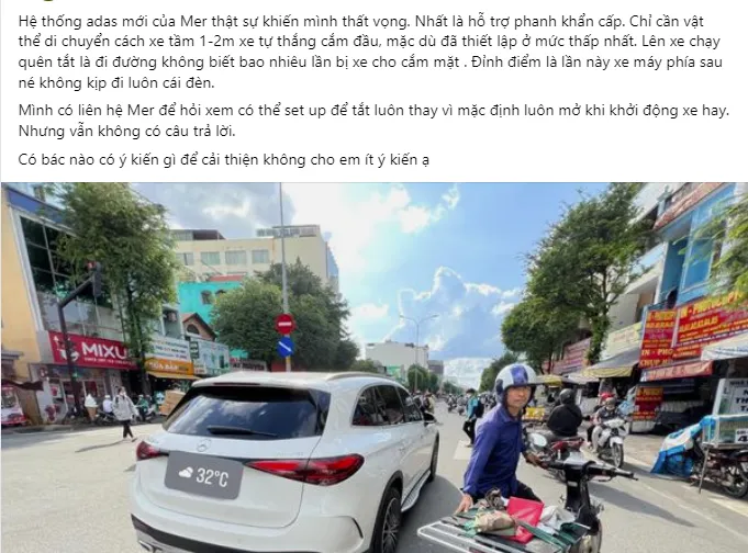 Cụ thể, người dùng chia sẻ trên mạng xã hội tình huống khó chịu gặp phải với hệ thống này khi đang sử dụng xe Mercedes-Benz GLC 300 thế hệ mới: “Hệ thống ADAS mới của Mercedes-Benz thật sự khiến mình thất vọng. Nhất là hỗ trợ phanh khẩn cấp. Chỉ cần vật thể di chuyển cách xe tầm 1-2 mét, xe tự phanh cắm đầu, mặc dù đã thiết lập ở mức thấp nhất. Lên xe chạy quên tắt là đi đường không biết bao nhiêu lần bị xe cho cắm mặt. Đỉnh điểm là lần này xe máy phía sau né không kịp, đi (bể) luôn cái đèn. Mình có liên hệ phía Mercedes-Benz để hỏi xem có thể tắt luôn thay vì mặc định luôn mở khi khởi động xe hay không. Nhưng vẫn không có câu trả lời”.