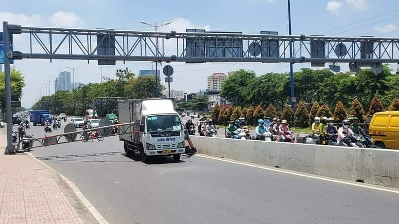 Khi đến cầu Sài Gòn thì thùng xe tải va vào thanh giới hạn chiều cao trong làn xe máy (P.Thảo Điền, TP.Thủ Đức, TP.HCM).