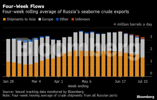 Dựa trên các điểm đến hiện tại, có thể nói dòng chảy trung bình của dầu thô Nga đến châu Á trong 4 tuần tính đến ngày 15 tháng 7 là thấp nhất trong vòng 15 tuần trở lại đây.