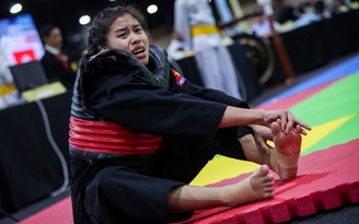 Nỗ lực tự sơ cứu không thành công như ý muốn, Hải Quyên lắc đầu báo “vẫn đau lắm”, nhưng cô quyết không bỏ cuộc. Nén nỗi đau, nữ võ sĩ Việt Nam lập tức quay trở lại thảm đấu.
