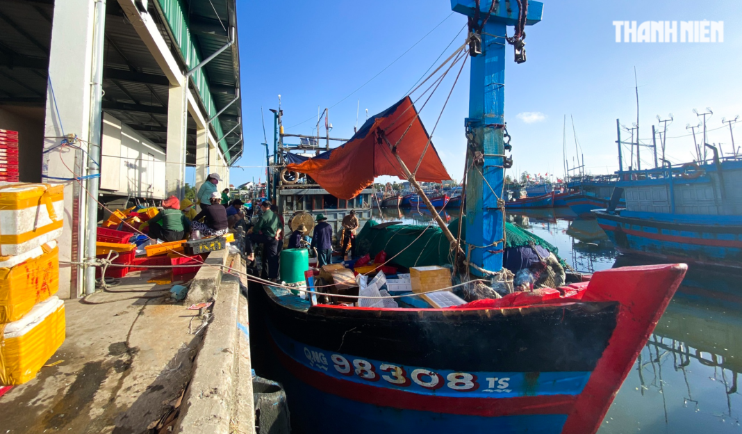 Tàu cá QNg 98308 TS của ngư dân Huỳnh Định cập cảng Tịnh Hòa (TP.Quảng Ngãi) để bán cá sau chuyến biển xuyên tết